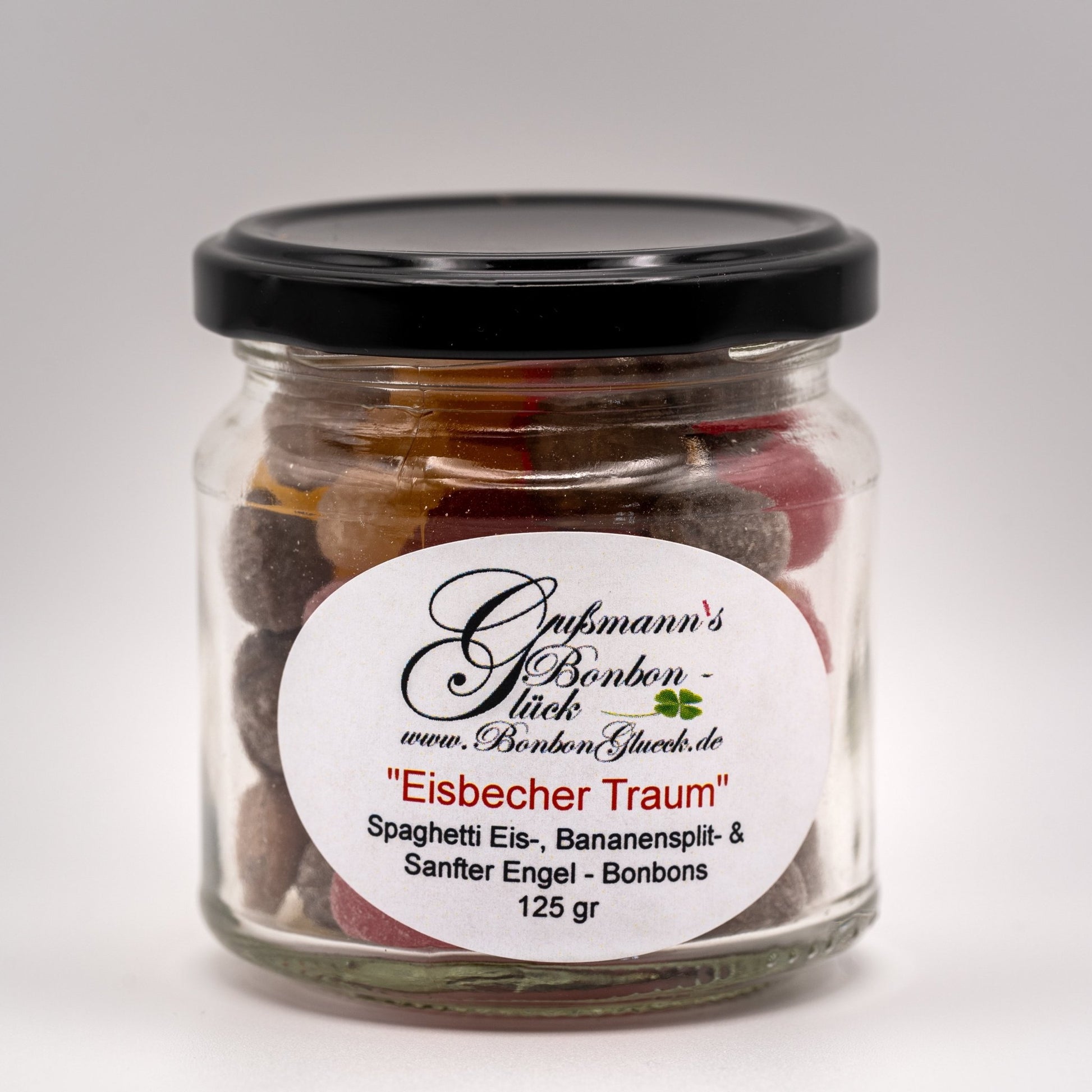 Die Bonbonmischung besteht aus Spaghetti Eis-, Bananensplit- & Sanfter Engel-Bonbons, im Glas mit 125 gr leckerem Inhalt