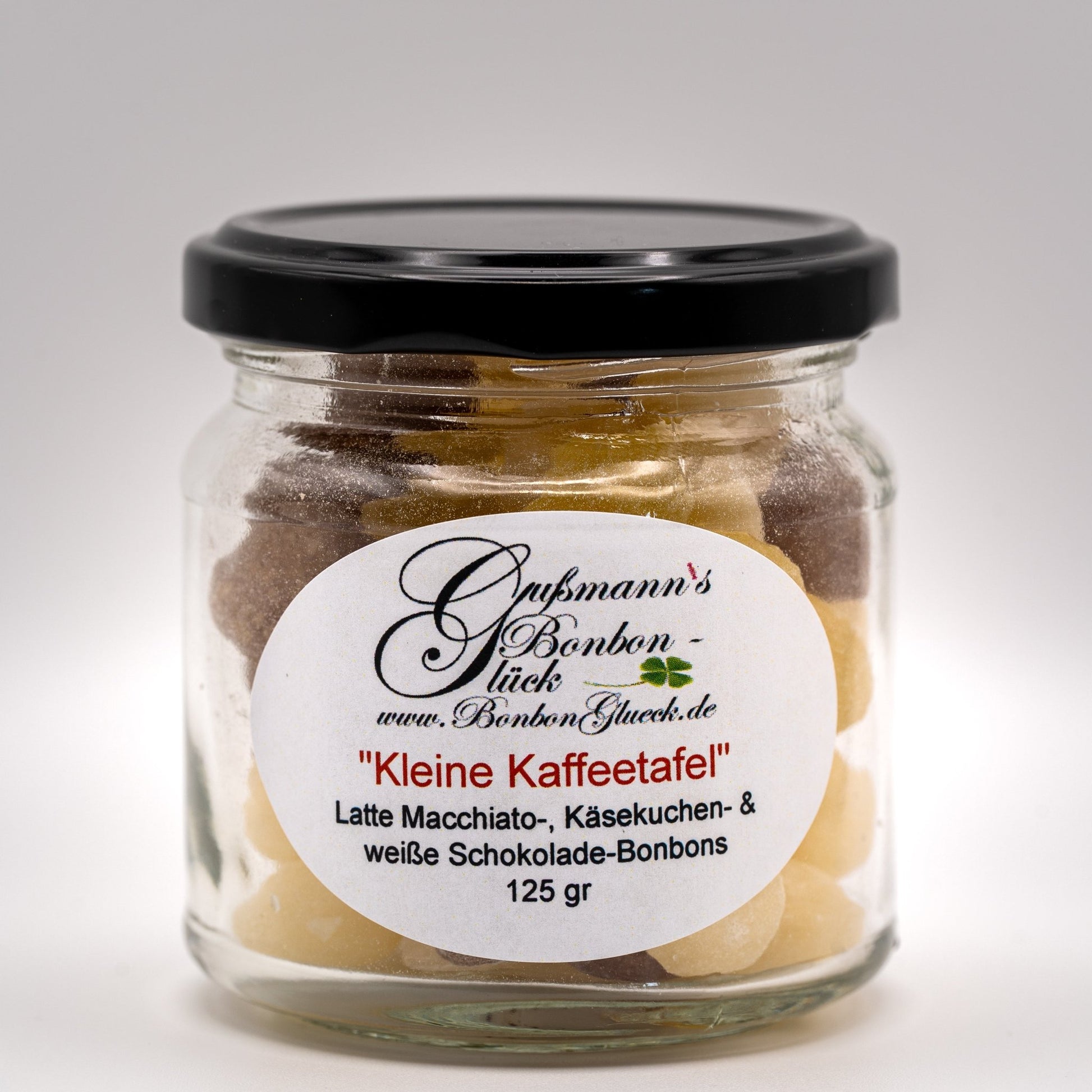 Die Bonbonmischung besteht aus Latte Macchiato-, Käsekuchen- und weiße Schokoladen Bonbons, im Glas mit 125 gr leckerem Inhalt