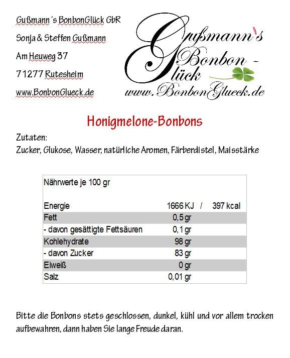Honigmelonen-Bonbons haben einen charakteristischen, süß-fruchtigen Geschmack, der dem natürlichen Aroma der Honigmelone entspricht.