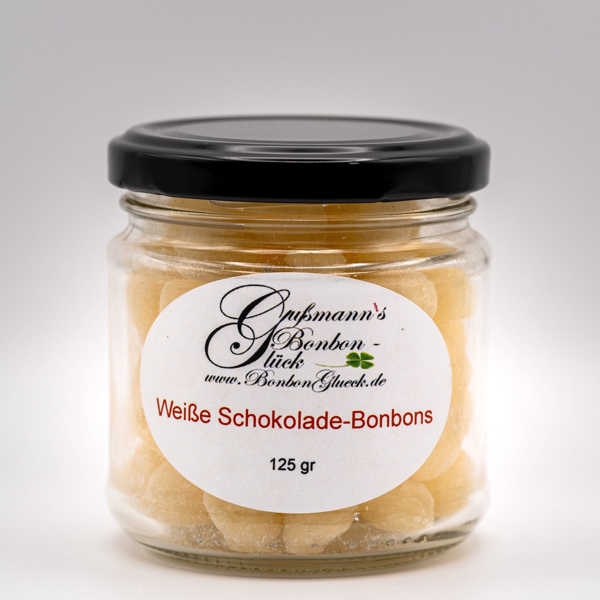 Weiße Schokolade-Bonbons im Glas mit 125 gr leckerem Inhalt